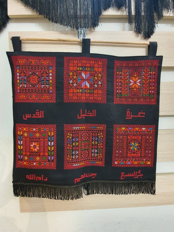Enhance your home decor with this stunning hanger, beautifully embroidered to celebrate the rich heritage of Palestinian cities. The vibrant colors and intricate designs reflect the unique stories of each city, making it a perfect piece to showcase your love for Palestinian culture. Adorned with a Kufiyah frame and black tassels, it’s not just a decoration; it’s a heartfelt connection to Palestine.